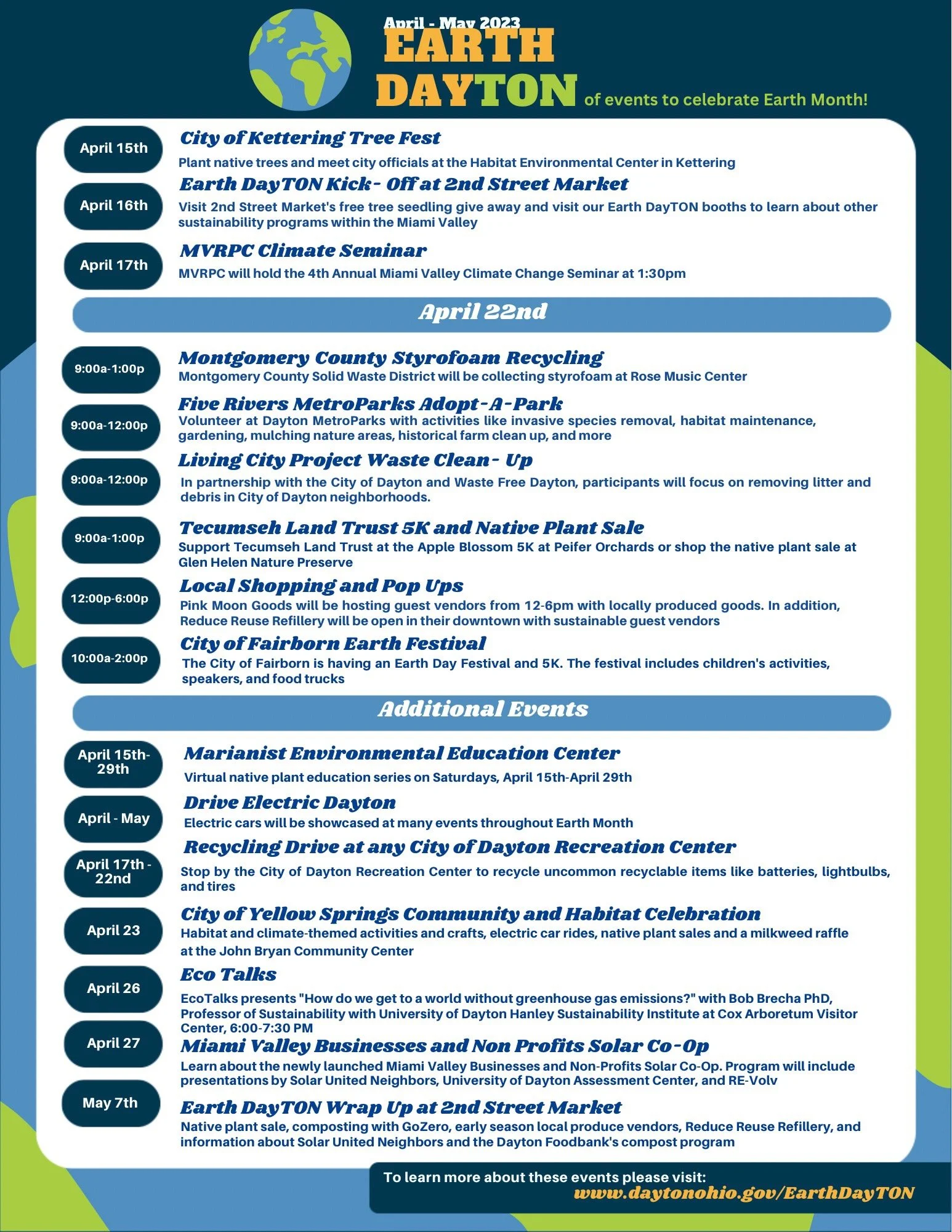 There are a number of events and activities taking place in the Dayton area during Earth Month. In addition to the events we have on our calendar, we will share other ways for you to be engaged this Earth Month.